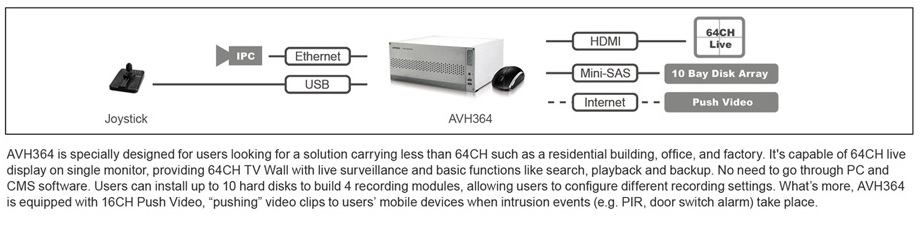 AVH364 is specially designed for users looking for a solution carrying less than 64CH such as a residential building, office, and factory. It’s capable of 64CH live display on single monitor, providing 64CH TV Wall with live surveillance and basic functions like search, playback and backup. No need to go through PC and CMS software. Users can install up to 10 hard disks to build 4 recording modules, allowing users to configure different recording settings. What’s more, AVH364 is equipped with 16CH Push Video, “pushing” video clips to users’ mobile devices when intrusion events (e.g. PIR, door switch alarm) take place.